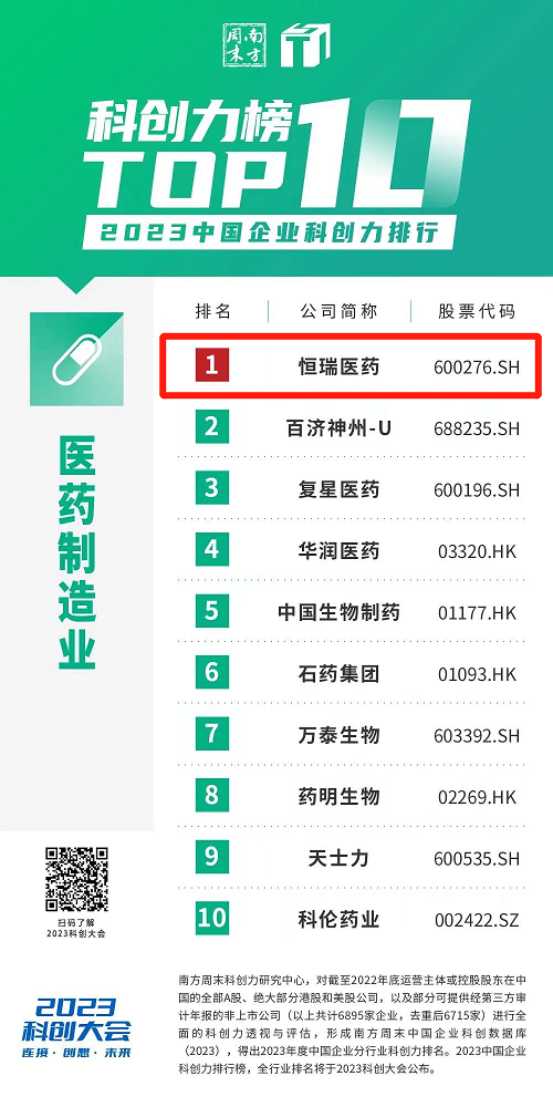 创新再获认可,G22恒峰医药蝉联“中国企业科创力排行”医药制造业榜首