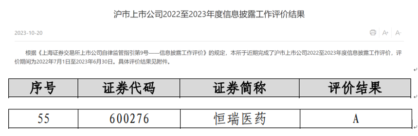 G22恒峰医药荣获上交所信息披露考评A级